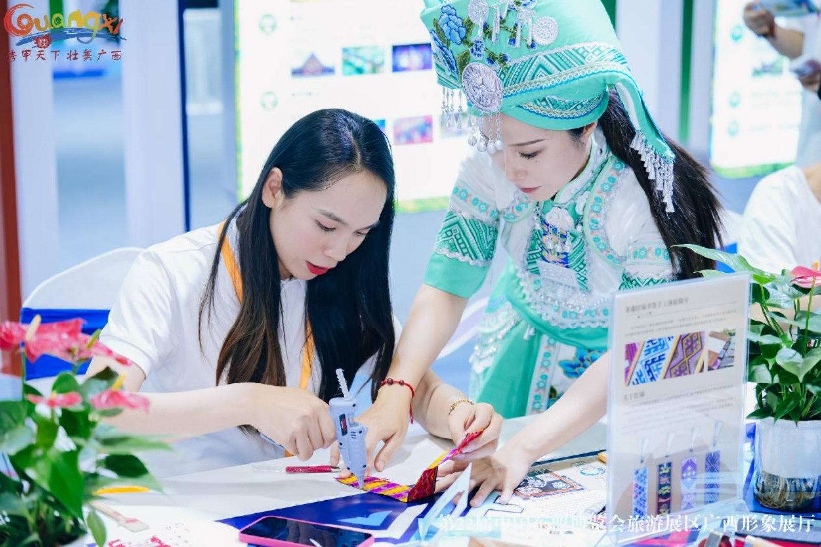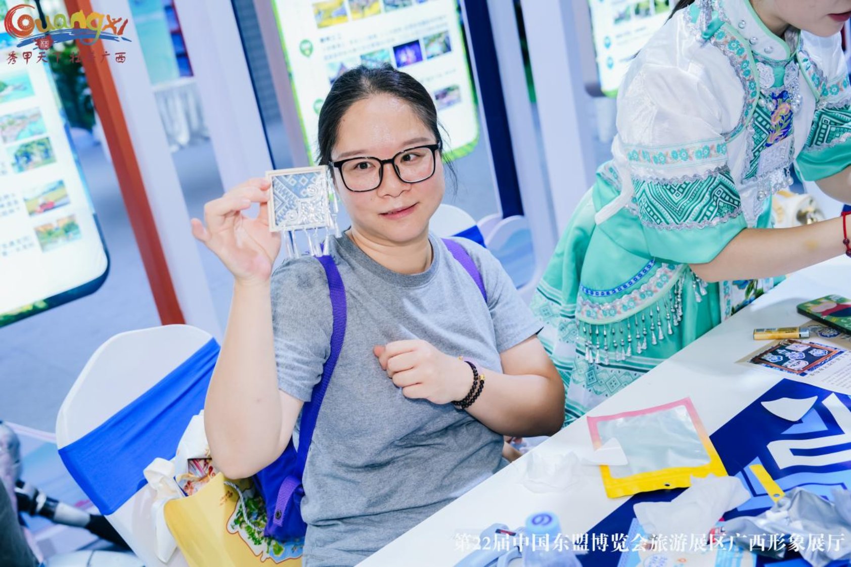 在互动体验区,游客关注“广西文化和旅游厅”微信公众号及抖音号、发布展会讯息,即可体验非遗制作技艺。体验项目有壮族扎染麽乜、壮锦银饰冰箱贴、非遗拓印扇子、壮锦书签等,成品兼具实用性与观赏性,深受游客喜爱,首日接待体验者超500人次。