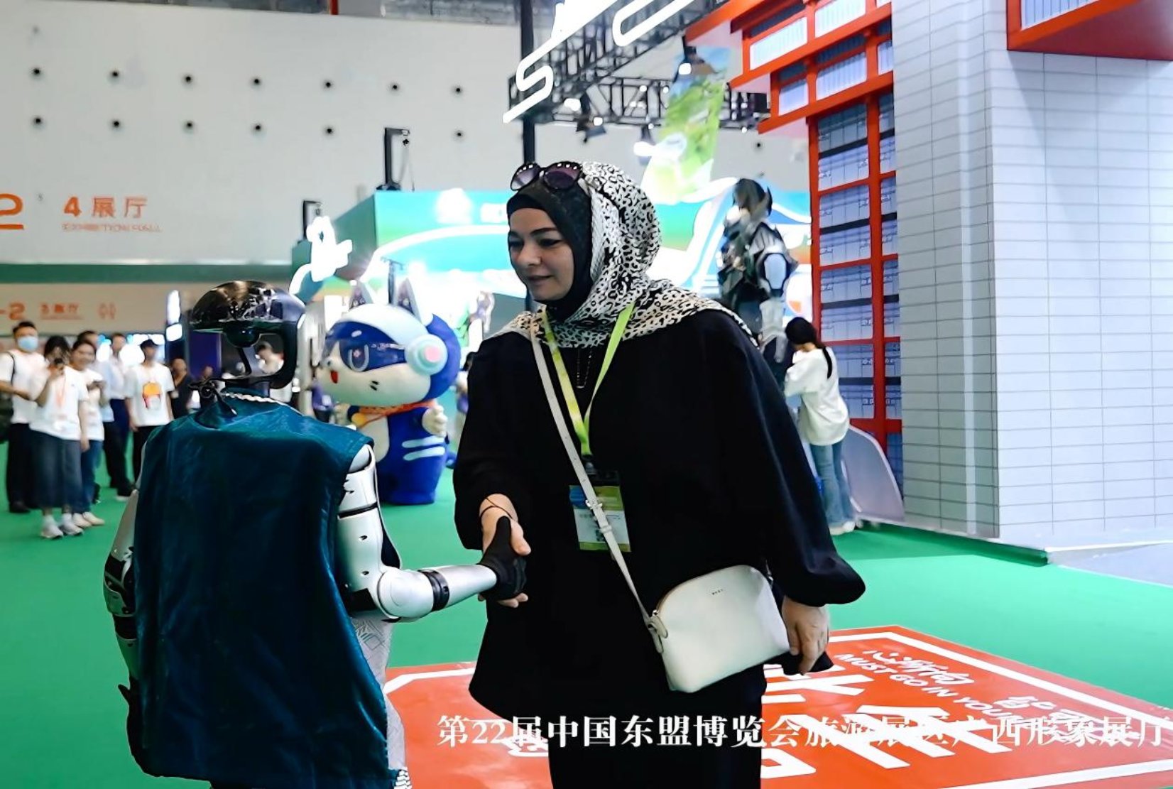 发布演绎区不间断播放广西文旅宣传片,充分展现广西丰富的文旅资源,并为游客准备了广西民族特色舞蹈表演和民族器乐演奏,还特别设置了民族机甲与AI机器人互动体验活动。身高3米穿着壮锦元素服饰的机甲不仅造型吸睛,还主动与游客牵手跳舞、摆出趣味姿势互动,AI机器人热情迎接每一位到场游客,成为现场人气打卡点。