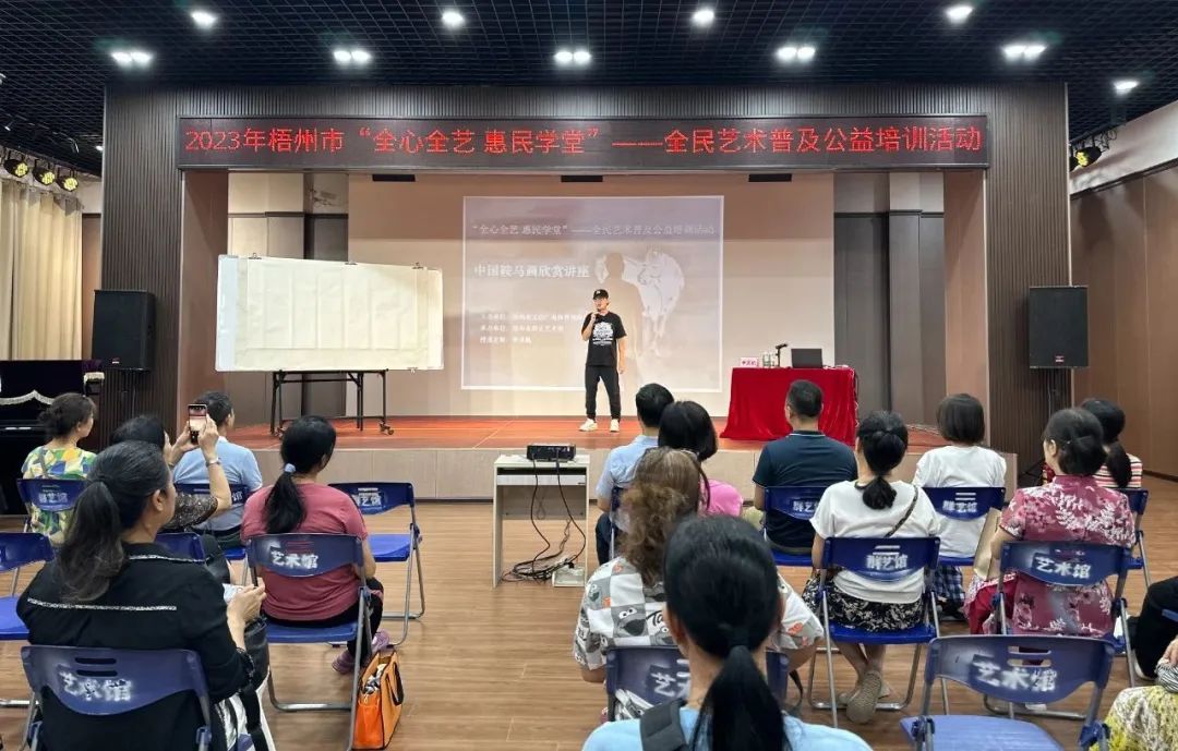 “全心全艺 惠民学堂”——全民艺术普及公益培训活动是梧州市文化广电体育和旅游局为进一步落实文化惠民工程,大力推进全民艺术普及,提高全民艺术文化水平,提升公共文化服务效能而推出的一项品牌活动。本次活动邀请自治区群众艺术馆馆长、一级指挥覃广周,一级演员陈强,一级美术师李灵机,二级编导廖玲莅临授课,有效提升了梧州市公共文化艺术服务水平。