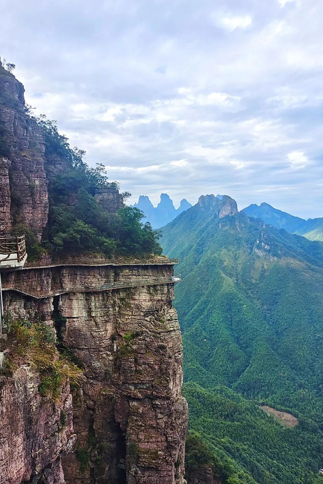 站在栈道之上, 脚下是青翠茂密的森林,隔着透明的玻璃,凭栏远眺,数峰齐天直立,势如刀削,蔚为壮观。