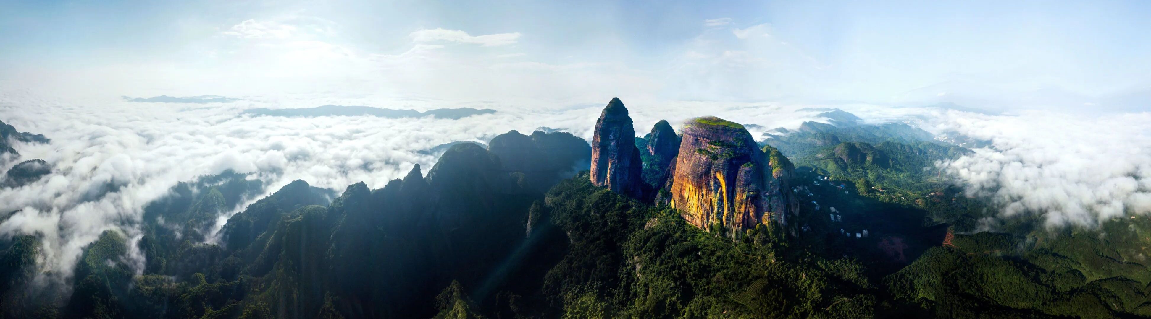 此地多云雾,当雾气升腾,众山沉浸其中,几处高峰像是雾里仙都,待到阳光铺在云雾上,经过衍射和散射,会形成一道道佛光和彩虹。