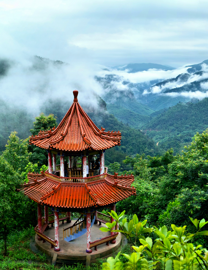 北帝山旅游区位于贵港市平南县大鹏镇,由北帝山主峰、五指山、泥顶峰组成,以“峰秀、林茂、石奇、花艳、泉清、雾仙”六绝闻名。