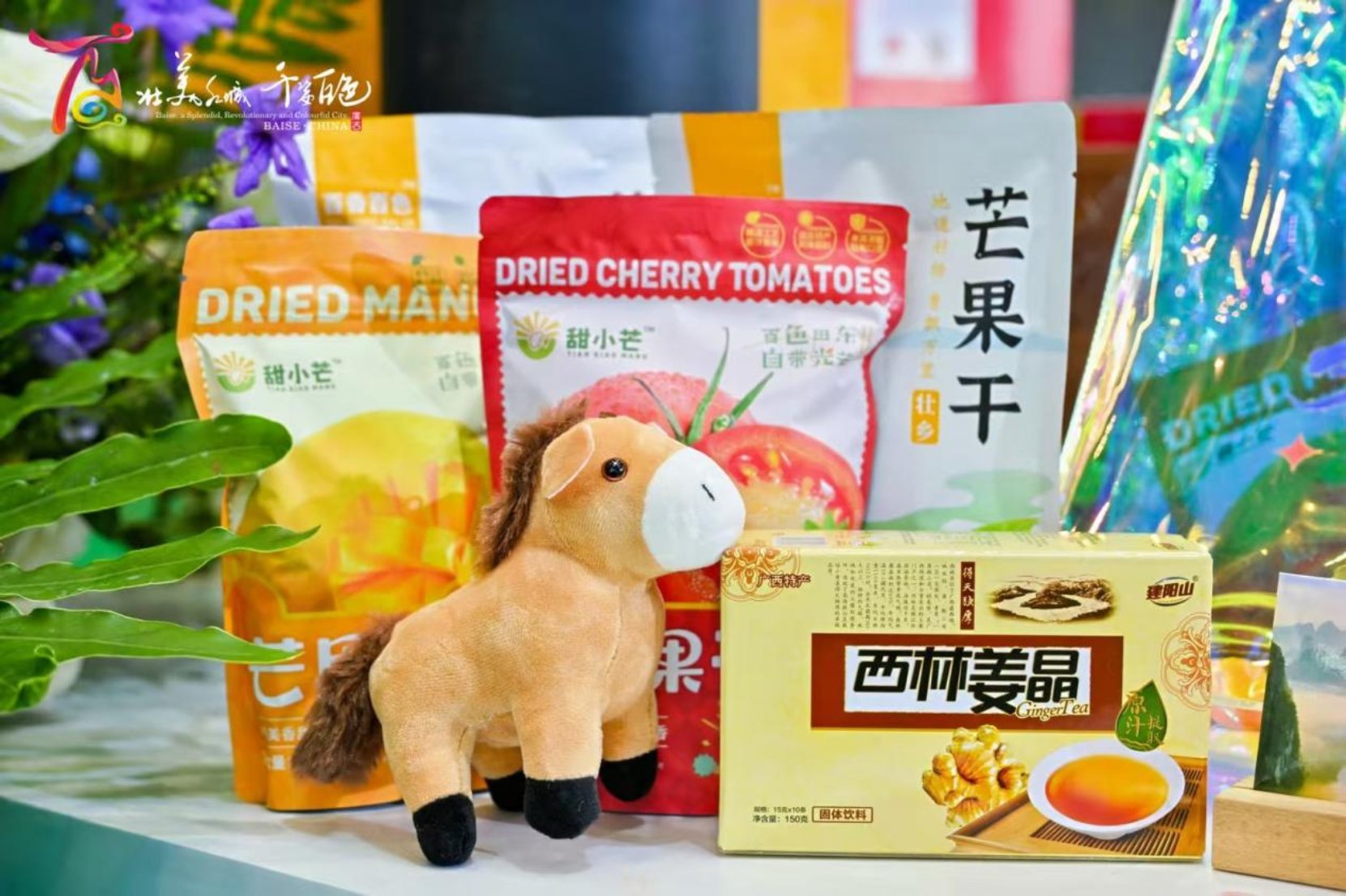“千姿百色,全域精彩”区通过360°圆形展台与四面灯箱,芒果干、百香果干等全域特色食品,以及红军钥匙扣、矮马公仔等通用文创,多维度呈现右江、乐业、凌云等地的旅游线路。