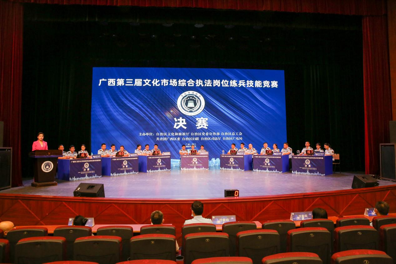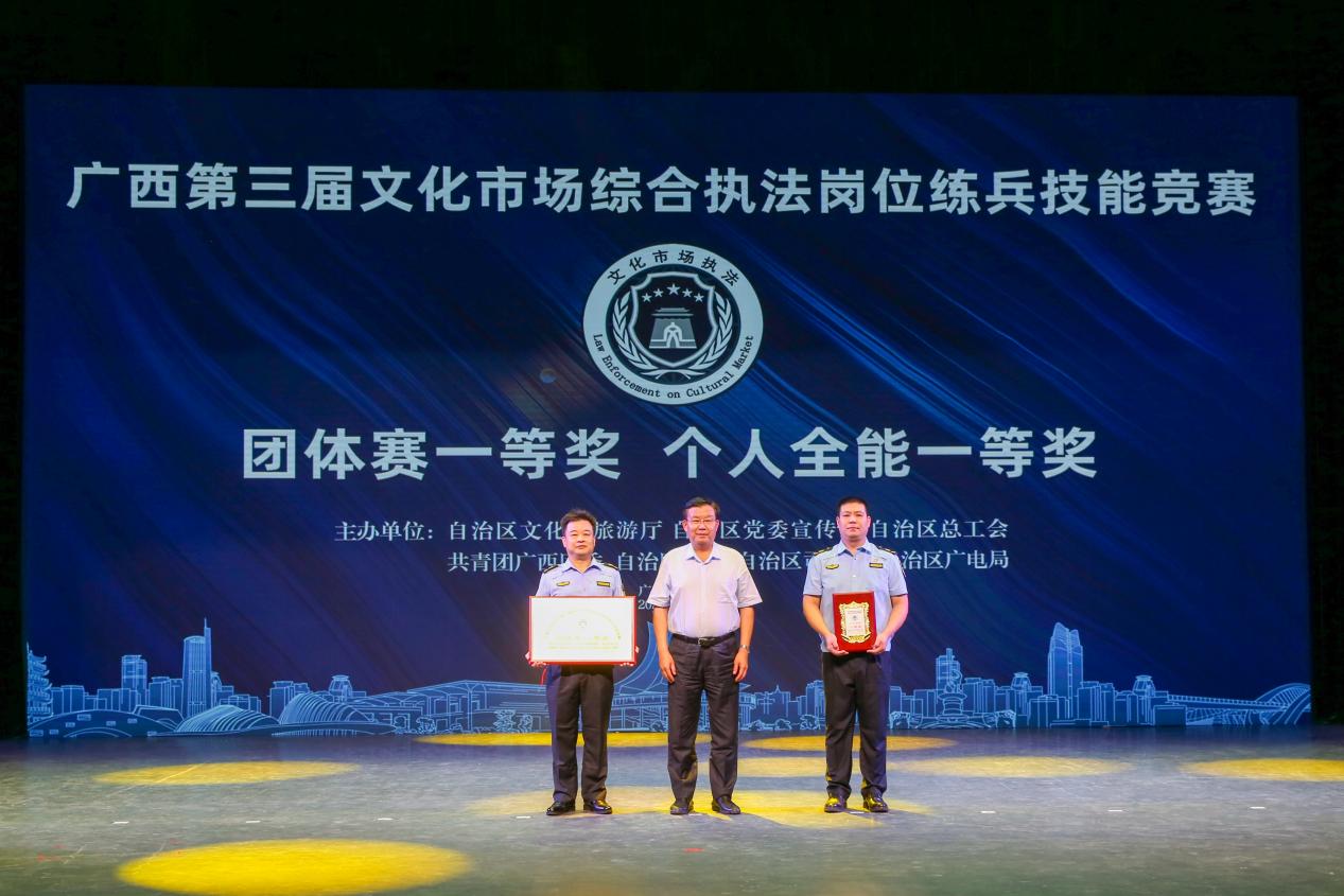 自本次文化市场综合执法岗位练兵技能竞赛活动开展以来,全区各级文化市场综合行政执法机构共有1421名执法人员投身到了岗位练兵活动中来,14支队伍、69名选手通过各市竞选进入了全区技能竞赛。最终,竞赛角逐出了团体赛和团体单项一、二、三等奖,个人全能和个人单项一、二、三等奖,共有7支队伍、14名选手荣获奖励。其中,柳州市代表队杨懿荣获个人全能奖一等奖,桂林市代表队荣获团体赛一等奖。北海、防城港、钦州、贵港、玉林、河池、崇左等7市代表队荣获组织奖。