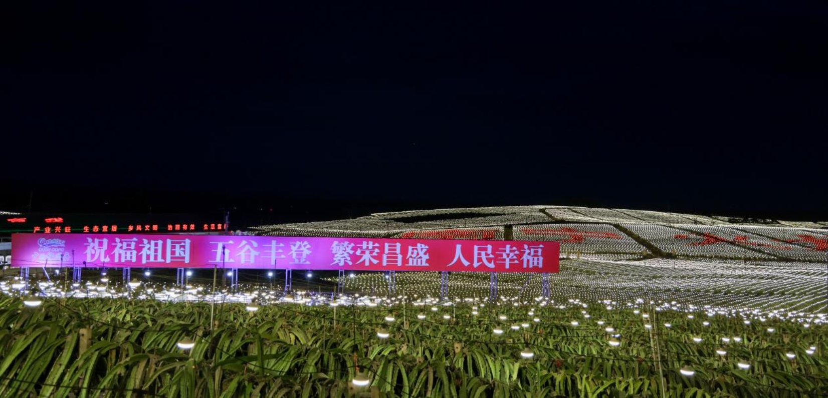 “文旅赋能 和美乡村”“祖国万岁 强国有我”“产业振兴 生态宜居 乡风文明 治理有效 生活富裕”等大幅海报,与用彩色火龙果灯组成的“南宁火龙果”“金穗农业”巨幅字样相互映衬,传递出对祖国的美好祝福。